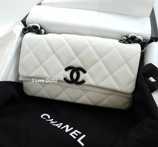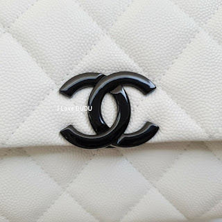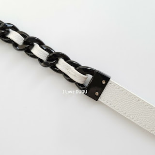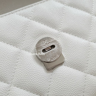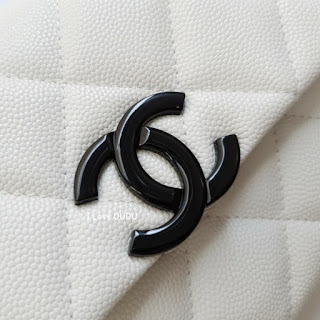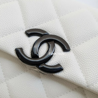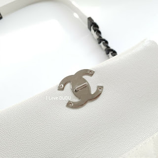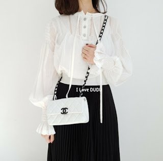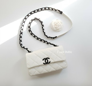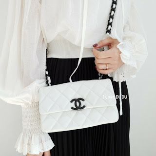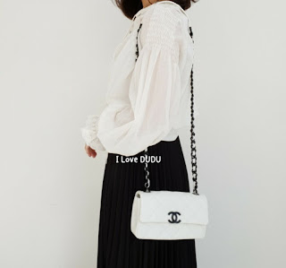 두두가 직접 촬영한 실사착 샷♡화려한 화이트칼라에 대비하는 샤넬의 상징 블랙CC 로고가 심플하지만 존재감을 강조합니다.